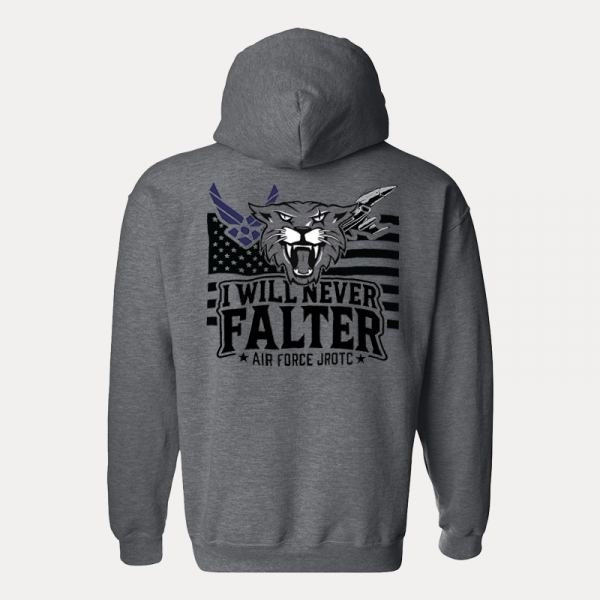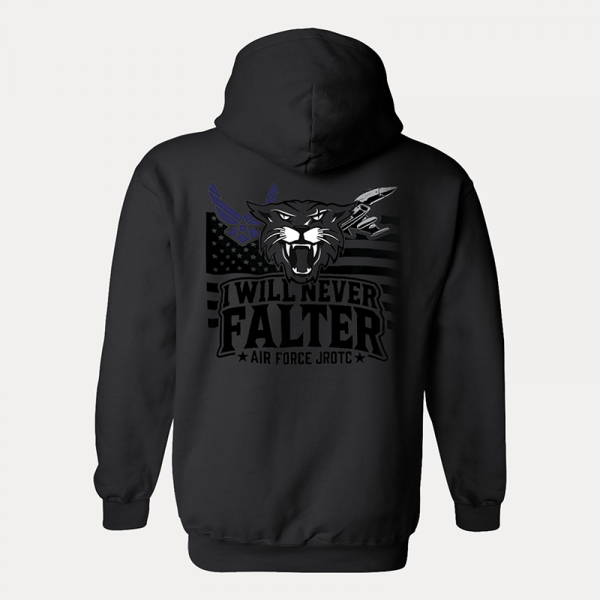 Show your resilience and pride with this custom Air Force JROTC t-shirt featuring the bold slogan “I Will Never Falter.” The dynamic design showcases a fierce Wildcat head over a stylized American flag background, symbolizing strength and patriotism. Personalize the shirt with a cadet name for a unique touch, making it a perfect keepsake or everyday wear for cadets and supporters alike.