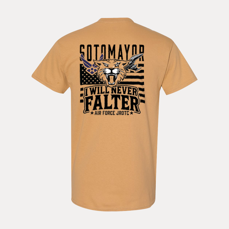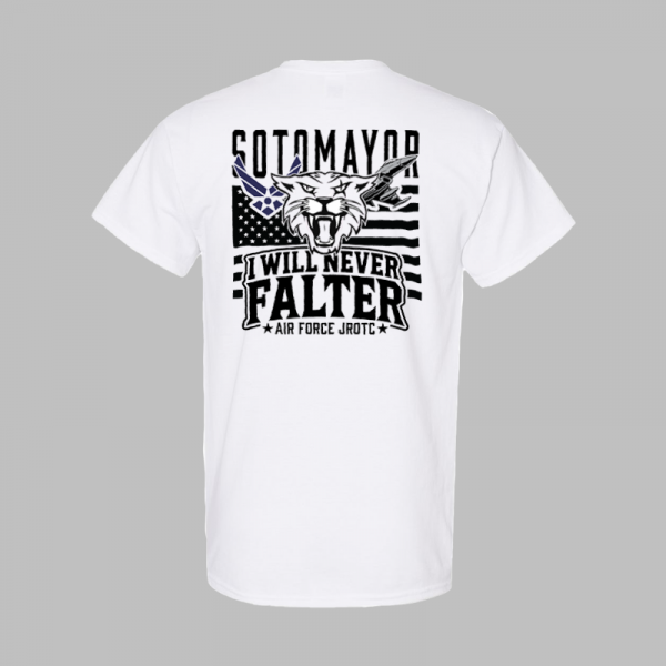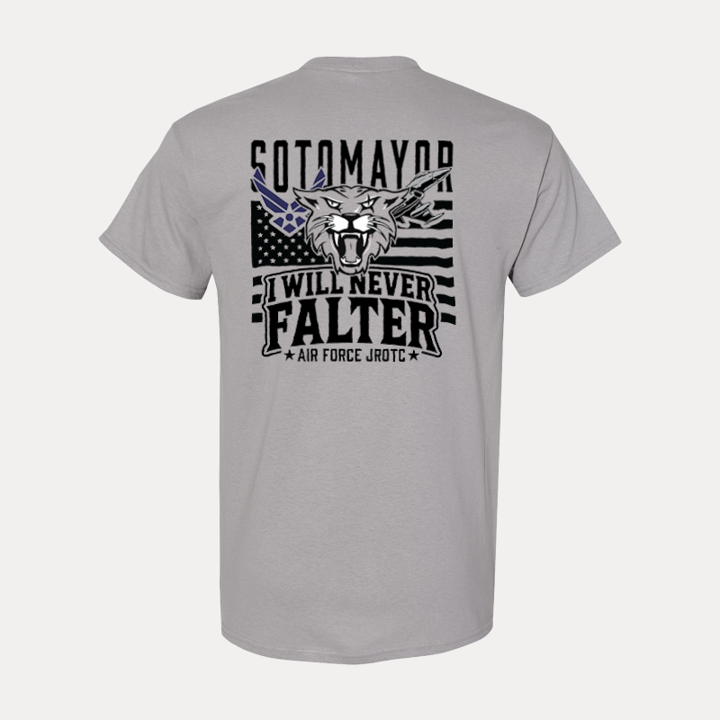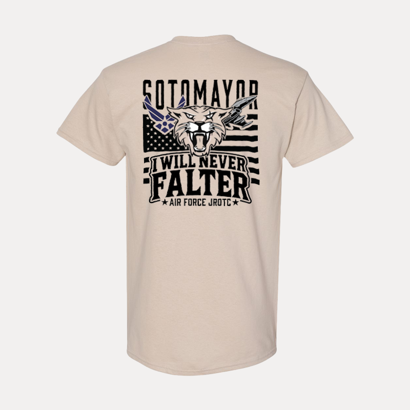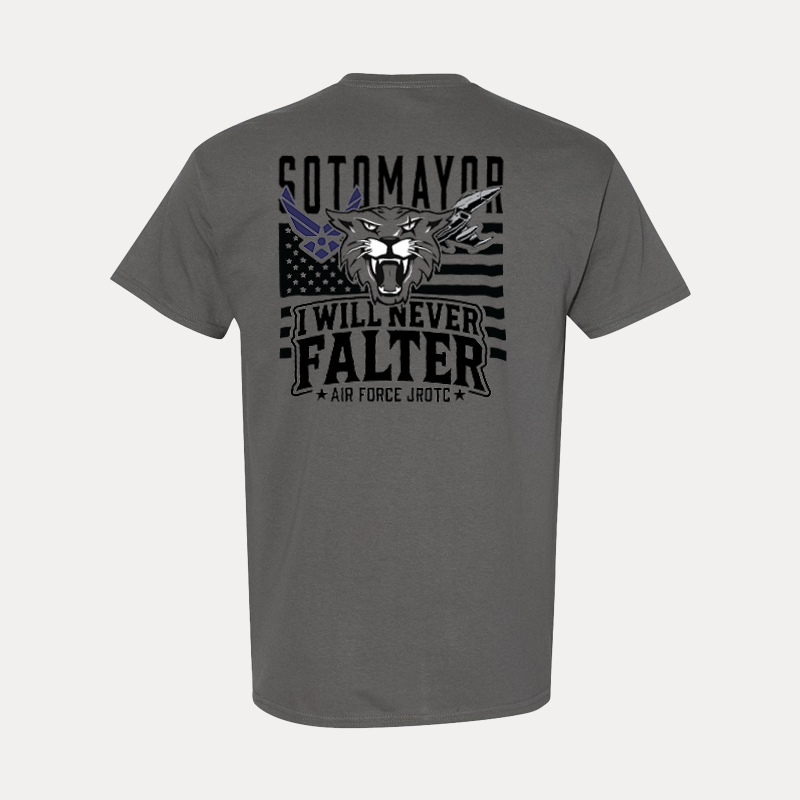 Show your resilience and pride with this custom Air Force JROTC t-shirt featuring the bold slogan “I Will Never Falter.” The dynamic design showcases a fierce Wildcat head over a stylized American flag background, symbolizing strength and patriotism. A perfect keepsake or everyday wear for cadets and supporters alike.