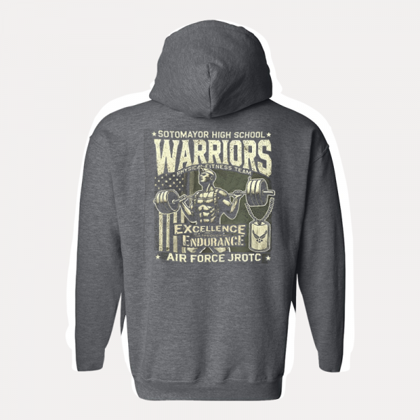 Push your limits and represent the Sotomayor High School Air Force JROTC Warriors Physical Fitness Team with this dynamic hoodie! Featuring a powerful design with a flexing warrior and the motivational slogan ""Pain is Weakness Leaving the Body,"" this hoodie symbolizes strength, resilience, and the spirit of those who strive to improve.