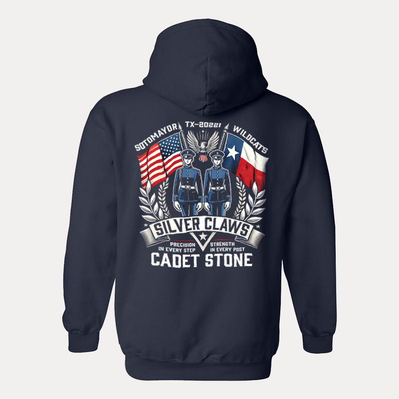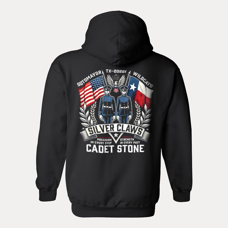 Showcase your pride and team spirit with this premium Silver Claws Air Force JROTC Drill Team Hoodie, designed for comfort, style, and durability. Perfect for events, practices, or casual outings, this hoodie features a bold design symbolizing discipline, strength, and honor. This striking hoodie features an iconic design showcasing two cadets standing tall between the U.S. and Texas flags.